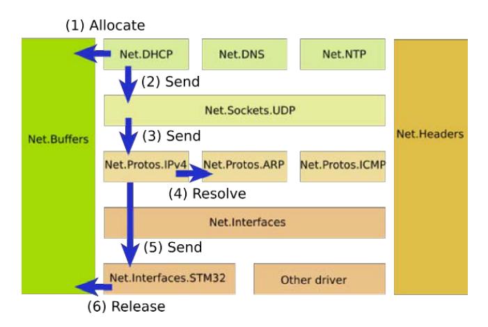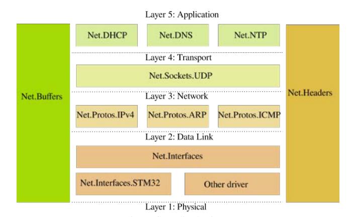 Використовувані всіма стеками мережевих протоколів, пакети Net.Buffers та Net.Headers надають глобальні типи даних та абстракції для представлення мережевого пакета або заголовка протоколу повідомлення. У нижній частині мережевого стека пакети Net.Interfaces та Net.Interfaces.STM32 відповідають рівню передачі даних моделі OSI, відповідальному за відправлення та отримання необроблених пакетів. Над ним (транспортний рівень у моделі OSI) розташований пакет Net.Protos.IPv4, який обробляє протокол IPv4 [4], пакет Net.Protos.ICMP, який обробляє протокол ICMP [5], та пакет Net.Protos.ARP [6], відповідальний за перетворення адреси IPv4 в Ethernet.
