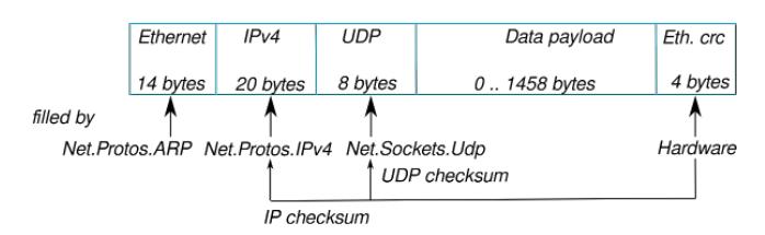 Пакет Net.Buffers забезпечує підтримку управління мережевими буферами. Мережевий буфер може вмістити один кадр пакета, тому він обмежений 1500 байтами корисного навантаження з 14 або 18 байтами для заголовка Ethernet. Як показано на рисунку 3, пакет має кілька частин, які контролюються різними рівнями моделі OSI. Для пакета UDP програма може заповнити до 1458 байтів даних. Протоколи Ethernet, IP та UDP визначають кілька контрольних сум. Усі вони контролюються апаратним забезпеченням за допомогою мікросхеми STM32F746.