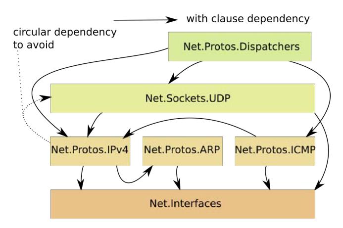Циклічна залежність була вирішена шляхом введення пакета Net.Protos.Dispatchers, який забезпечує прийом пакетів і обробку їх відправки до протоколів верхнього рівня.