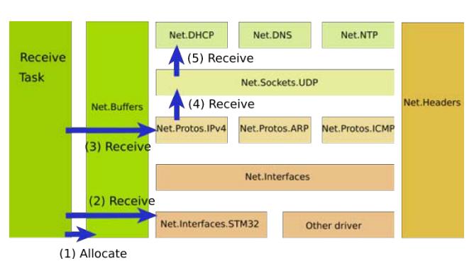 Оскільки прийом пакета є блокуючою операцією, для обробки прийому пакета необхідне завдання, і ця робота повинна виконуватися додатком. Дійсно, при проектуванні та реалізації вбудованої мережі Ada було прийнято рішення уникнути нав'язування моделі завдань для обробки прийому мережевих пакетів і замість цього залишити це додатку. Це дозволяє додатку вибирати різні стратегії для обробки прийому мережевих пакетів. Наприклад, програма може вирішити призначити пакет різним завданням залежно від типу пакета.