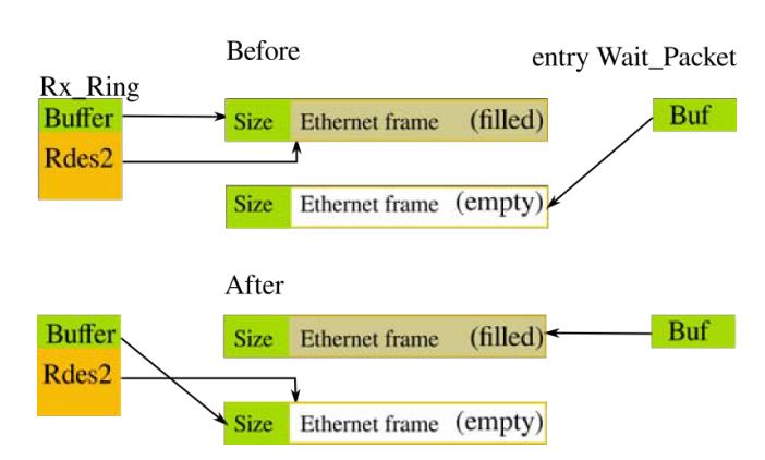 Кільце прийому Ethernet представлене записом Rx_Ring, а кільце передачі --- записом Tx_Ring. Кожне з них містить об'єкт Buffer_Type, який представляє буфер пакетів, пов'язаний з дескриптором кільця. Сам апаратний дескриптор вказує на початок буфера даних, що представляє кадр Ethernet. Коли пакет отримано, контролер Ethernet заповнює кадр Ethernet і встановлює в апаратному дескрипторі таку інформацію, як розмір отриманого пакета та інші прапорці дійсності.